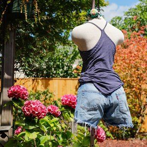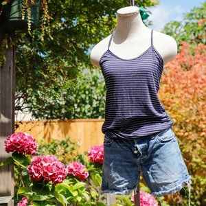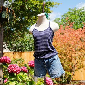 From Mudd brand. Well worn because it's so comfortable! Thin stretchy jersey fabric that drapes perfectly, thin straps that go into thin racerback. Rounded hem, longer in the back. Navy blue with white stripes adds to the classic feel of this tank. Very flattering, I got compliments every time I wore this. Perfect summer time go to, so light and breathable and comfortable. Light pilling but still lots of miles left on this for your summer adventures.