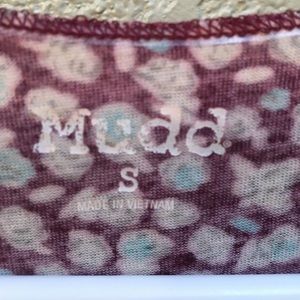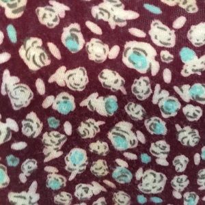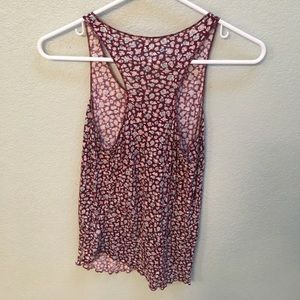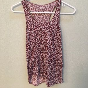 This is a really soft and stretchy racerback tank top with light blue and cream colored roses over a burgundy background.