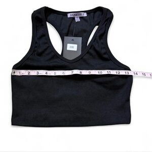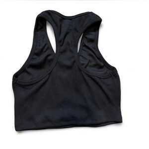 Racerback Cropped Tank Top. Features a lightly ribbed fabric, scoop neck, and racerback.