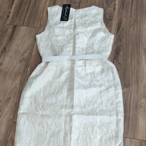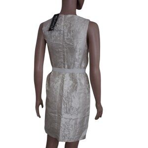 Rachael G. for the sophisticated woman. This dress is new with tags. It features a round neck, sleeveless design, and a back zipper. It features a beige floral print. It comes with a belt and is lined inside. It's in a clean, smoke-free, and pet-free environment. Please note that the color in the photos may appear slightly different from the original due to variations in lighting.