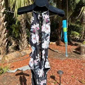 Rachel Rachel Roy one piece black halter swan song bathing suit size XL Too Big in bust area. Beautiful floral print, sexy one piece suit that actually covers and holds you in and is still sexy! Pet friendly home!