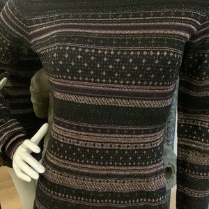 Mini designer dress, knit material with gold shimmer, turtleneck with cut out in back. Great for holidays, and New Year’s Eve.
