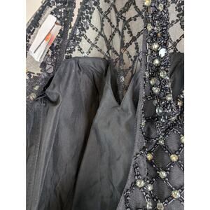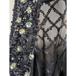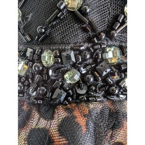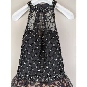 Lovely Rachel Allan cocktail dress. Animal print with tulle overlay on skirt. Sweetheart illusion neckline covered with detailed embellishment. Hand beaded. Chest is lightly padded. Zips in back. Very good condition with just a couple of loose beads (see pics).