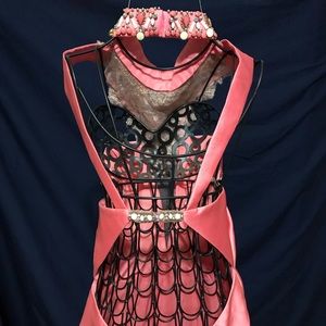 This beautiful, body hugging stunner will be the talk of prom. The coral color will stand out in any crowd. The beaded neckline extends up to a halter neckline. The open back is secured by one beaded strap around the waist. The skirt is mikado and the hem is lined with 3 inch horsehair to help hold its shape.