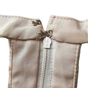 Back Zipper Closure with clasp, top clasp has fallen off, but I think could be easily added if you have the simplest of seamstry skills. Beautiful beaded neckline. Padded