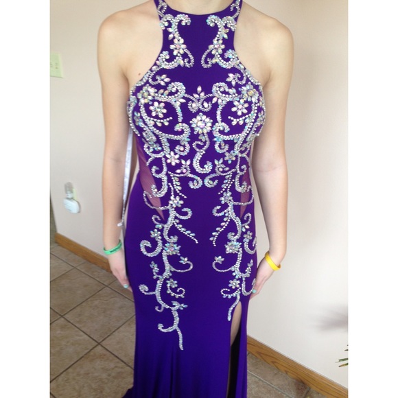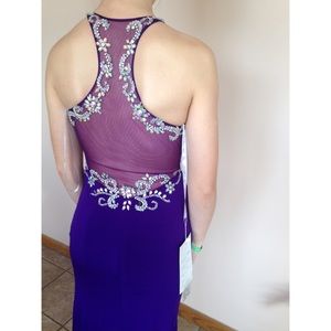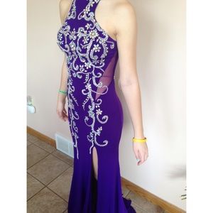 Beautiful Rachel Allan purple prom gown with iridescent jewel embellishments! Purple mesh on sides and back. Also has leg slit & a small train. No alterations! Worn once. Size 4