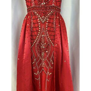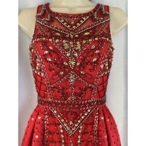 Stunning formal gown! Features intricate stone beading, mesh shoulder panel, open back design, and a full bodied skirt. Fully lined, lightly padded cups, back zipper closure.