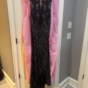 Gorgeous Rachel Allen gown. Size 2 with tags style # 70850. Perfect condition only worn for an hour for photos like new with tags. Beautiful black with silver crystals. Slit on side with small train. Spaghetti straps and padded push up bra inserts included that can be detached, This dress is extremely flattering to the figure. Purchased brand new last month from First impressions in Jacksonville, Arkansas. The garmet bag is included. Model in photos is 5 ft. 5 in. and 120 pounds for reference.
