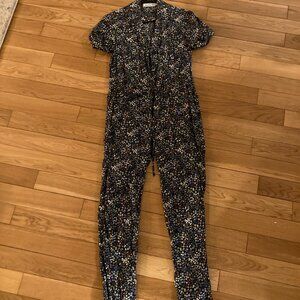 Black short sleeve jumpsuit with blue, orange, and white floral pattern. Has a collar and waist drawstring, buttons and a zipper fly. Great condition!