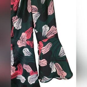 A knee-length A-line dress by Rachel Antonoff with ruffled 3/4 bell sleeves and a crew neck, featuring a vibrant pink and red floral pattern on a forest green background.