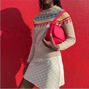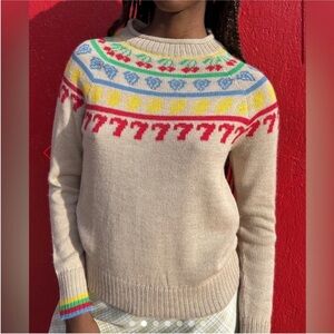 A soft and cozy crew neck knit sweater from Rachel Antonoff. Features cherry, diamond lemon and lucky number 7 intarsia knit motifs.