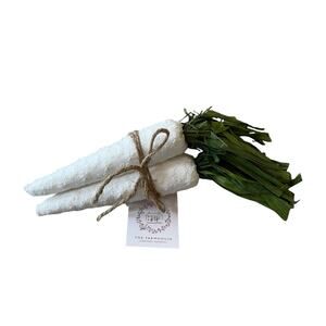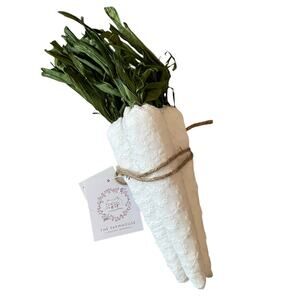 Add a shabby chic touch to your Easter or Spring decor with these Rachel Ashwell Farmhouse White Decorative Carrots. This set of three solid white floral carrots makes a charming bowl filler or display piece for your home. With their soft, neutral tones, they blend effortlessly with any seasonal or farmhouse theme. Brand new and spot clean only — perfect for adding a delicate, festive flair to your table or mantel.