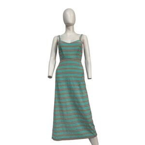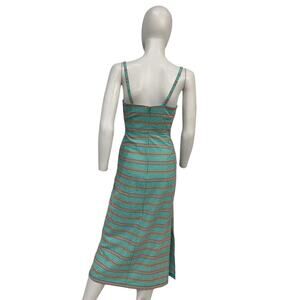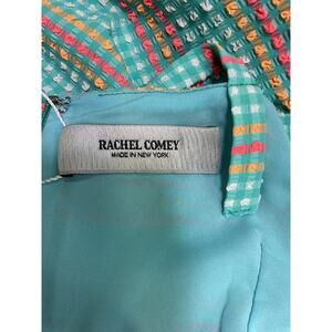 Rachel 'Comey' Blue Polyester Agitator Dress Size 0: spaghetti strap, fitted bodice, back zipper closure, vent at side body hem and v-neckline, the midi length dress is made from a stretchy stripe embossed seersucker fabric.