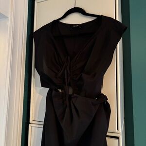 - Ruched, necktie A-line dress with cutaway bodice and open back, in Crisp cotton poplin.