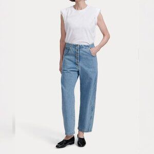 The Elkin Pant is one of our all-time favorites, cut this season in our Washed Mission Denim in Celeste, Japanese denim with subtle distressing that opens up and softens with wear. This style can sit at the lower waist, on your hips, or tighten the back strap to wear higher at your natural waist. Angled darts give the leg a subtle cocoon shape that ends in a slight crop.