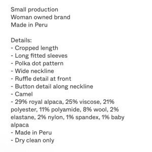 Rachel Comey Embrace Alpaca Wool Blend Sweater Knit Polka Dot Crop M Tan Camel