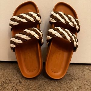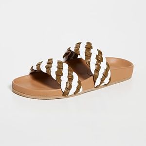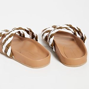 Brand new, never worn. Easy slides with an elegant finish. These Rachel Comey sandals feature woven leather straps in a white and olive color for an understated version of an easy, warm-weather shoe.