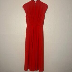 Pleated midi dress in Electric red. Mockneck w scalloped piping. Top-stitched waistband. Cap sleeves with small tugs and raglan seams. Keyhole shape at back neck with zipper and button closure.