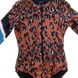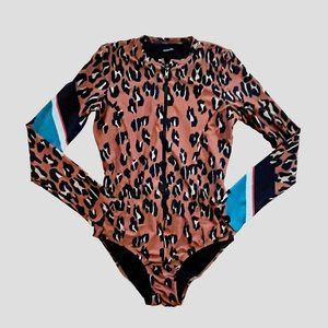 Rachel Comey Long Sleeve Leopard Print Stripe Accent Front Zip One Piece Swim
