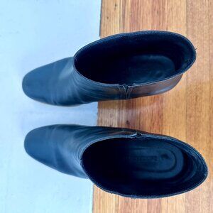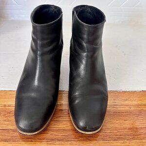 Iconic Rachel Comey Mars boots in Black Leather. These are high-quality and well-loved slip-on black leather booties in good used condition. The perfect, neutral, everyday boot that is very versatile and gives a sleek and modern silhouette. Pairs nicely with skirts, dresses, and jeans. Despite the 3" heel height, you can walk comfortably in these boots all day and all night long as the block heel provides comfort and stability!