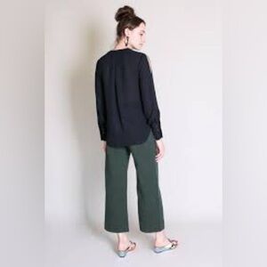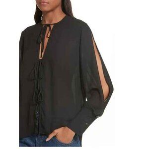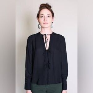 Relaxed fit. Long sleeves with elongated, narrow cuffs. Two-button cuff closure (two other buttons are decorative). Slit running along the sleeves. Split neckline with optional front tie closures (three of them). Modesty placket under the last two ties. Curved hem. Unlined, slightly sheer. Lightweight, non-stretch fluid fabric. 100% polyester. Made in USA. Machine wash warm (dry clean possible).