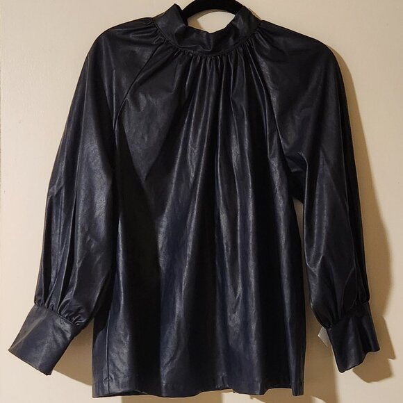 Rachel Comey NWT Medium Deep Navy Faux Leather Blouse Tie in the back, buttons down the back, gathered sleeves and neckline. 24-inch sleeves, 25.5 length.