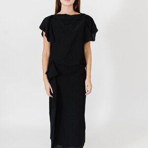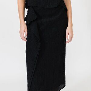 Become the life of any party with the Rachel Comey Nesom Skirt – a bold reimagining of feminine silhouettes. This sassy number features a faux wrap design that says "I'm sophisticated" while the playful ruffle cascading down the front whispers "but I know how to have fun!" Crafted from a premium textured fabric with inherent bounce, the piece maintains structure while offering exceptional lightweight performance. A discreet side zip closure ensures a streamlined appearance while the below-knee hemline demonstrates versatile proportions suitable for seamless day-to-night wear.