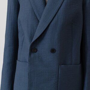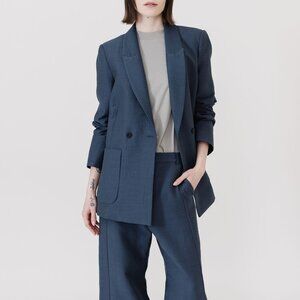 The Rachel Comey New Amboy Blazer- a versatile choice for any wardrobe. This boxy, double-breasted blazer features a long and straight silhouette, crafted from RC signature Italian Foam jacquard. With a narrow peak lapel and convenient patch pockets, it's both functional and fashionable. The double vents at the back provide a flattering and comfortable fit.