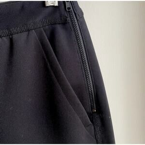 Extra details: Thick knit material, flat front with pockets, exposed side zipper closure, exposed seam detail