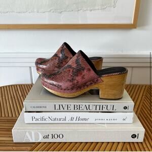 Classic closed-toe clog with a chunky carved wood platform. Go up half a size for mid to wide feet; fits true to size for narrow feet.