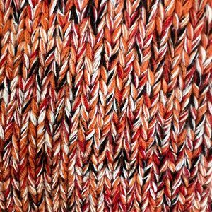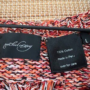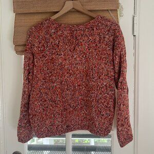 red, white, black, and orgnge sweater. Back is slightly longer than the front