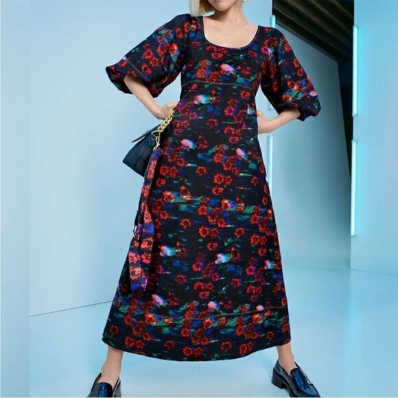 Rachel Comey x Target Kodak Red Floral Midi Dress Empire Waist Black Size 6. Balloon Sleeve. Side Inner Pocket Fit: Loose Fit. Three Quarter Sleeve, Pull On. Neckline. Scoop neck. Understated, everyday glamour Target Limited edition Fall Designer Collection. 90% Rayon, 10% Polyester. Gently used Excellent Preowned Condition. No holes or stains.