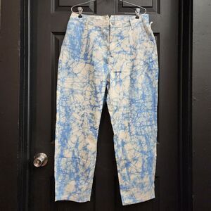 The Tye Dye Print High-Rise Tapered Jeans from Rachel Comey x Target make a stylish pick for the modern woman's wardrobe. These high-waisted jeans feature a tapered leg with an ankle cut for a more relaxed fit and look that pairs well with many outfits. An abstract print in blueand white sho wcases designer Rachel Comey's thoughtful creations, and a buckle at the back of the waistband adds an extra touch of detail. 100% cotton fabric creates a more structured fit and feel for a well-designed pair of denims.