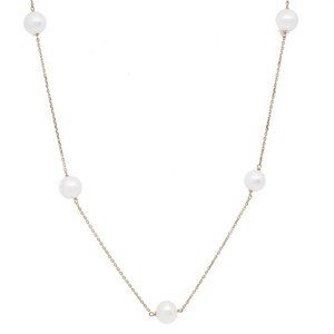 Beautiful and delicate this pearl chain necklace will leave everyone speechless the moment they see it. Crafted in high polished solid 14K yellow gold this necklace is set with 9 round shaped white fresh water pearls. Be the first one to get it or someone else will. Total weight: 4.25 grams. Necklace length: 17.5 inches, Pearl size: 6.5mm. Comes with a presentable gift box.