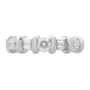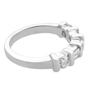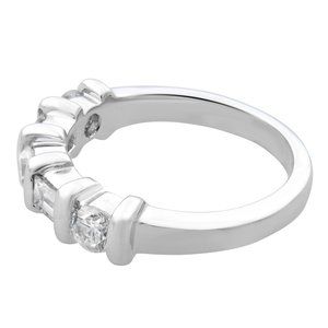 This 0.66 carat total weight diamond wedding band features 3 brilliant round cut and 2 baguette cut diamonds coupled with smooth, lustrous vertical rounded channels. Diamond color G and SI1 clarity. This band is crafted in 14k white gold. The width of the band is 4.60mm. Ring size 5.5. Comes in our presentable jewelry box.