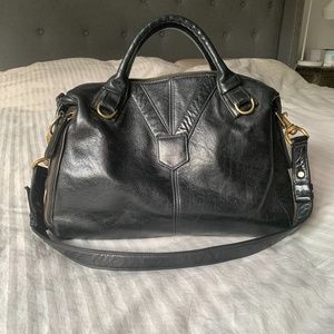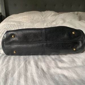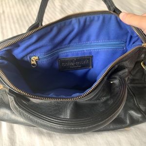 An everyday satchel in luxe black leather will lend a chic finish to all your Autumn looks. Zip top Double rolled handles with 3.5" drop. Gold hardware. Footed. Removable 13.5" shoulder strap. Exterior side pockets with leather zipper pulls. Interior pockets. Royal blue lining. Good condition. Purchases at Bloomingdale's for $525. Selling for $79.