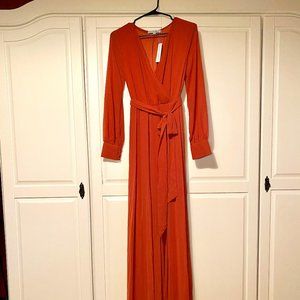 Chic long sleeve maxi dress by Rachel Pally. Features a flattering V-neckline and elegant drape. Snake print. Super soft and flowey. Can be tied back or left to drape. Could even be used as a maternity dress!