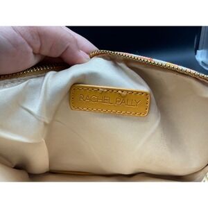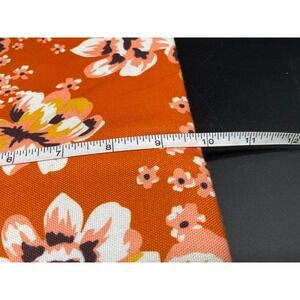 Oversized zip pouch by Rachel Pally featuring a bright orange floral fabric front and smooth mustard-tone vegan leather back. Gold-tone zipper with red tassel pull and a soft beige interior lining. Measures 12"x10"—sized to fit most standard tablets, documents, or travel accessories. No interior compartments or tags beyond branded label.