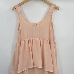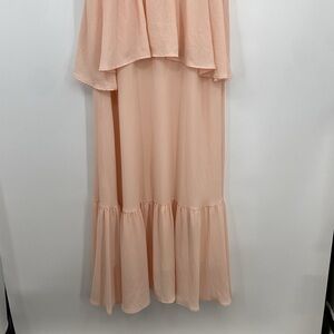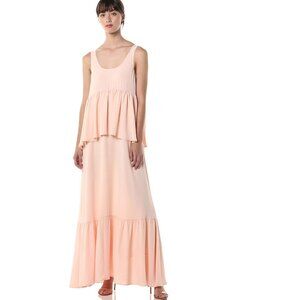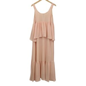 Rachel Pally Maude Maxi Dress Womens Size X-Small XS Orange Peach Layered Sleeveless. Peach color with ivory sheer underneath. Tiered Dress. Maxi length. Open scoop neck. Empire waist. Ruffle bodice detail. Ruffle skirt detail. Flowy and Relaxed. 97% Polyester, 3% Spandex. Lining: 100% Polyester. Hand Wash.