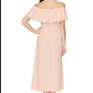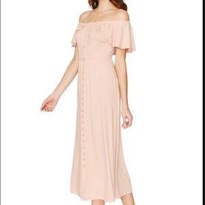 Rachel Pally "Preston Dress" size small, NWT, sold out. Chic classic jersey. Ruffle off the shoulder, snap button front, pretty blush color called champagne, maxi length, elastic waist and shoulder makes it fitted yet forgiving. Rachel Pally dresses are famous for being perfect for women's bodies before, during, and after pregnancy. Perfect fit if you're not pregnant, or are pregnant, or nursing.