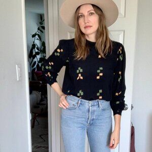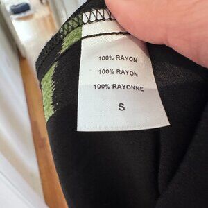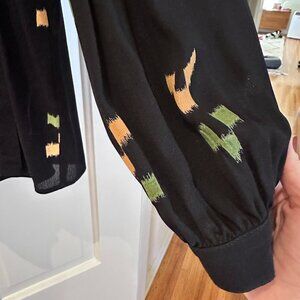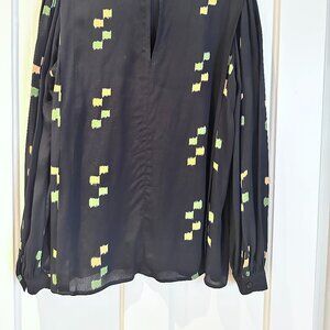 Rachel Pally Silvia Top in Ikat-size small. This top is 100% Rayon and gives a light, silky touch. There is a necktie back button closure. I'd say the fit is slightly oversized at the bodice so that you can tuck it in to pants or skirts, but the shoulder and neck area are fitted. The sleeves are also a little relaxed are easy to wear down or scrunched up per your preference (I like them scrunched!). Dry clean recommended. Made in USA.