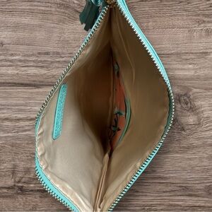 Design & Features: It's a fold-over clutch that is reversible, offering two distinct looks in one bag. One side features a patterned canvas, while the other is a solid color in vegan leather. It features a zip closure with a tassel pull and includes an open interior pocket.