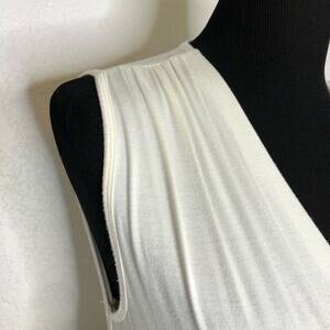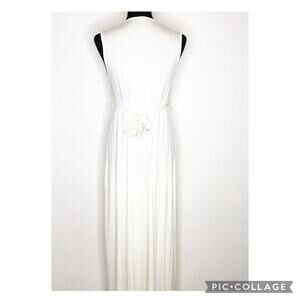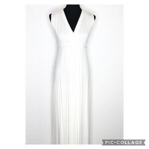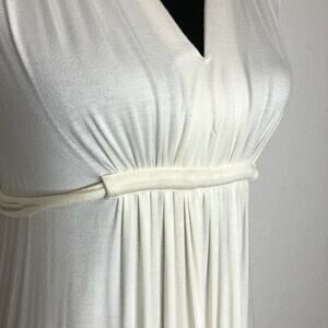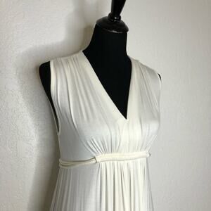 Rachel Pally ivory cream sleeveless caftan maxi dress. V neckline. Pleated at shoulders. Gathered at waist and ties in back. Long flowy skirt. Sleeveless. Super soft. Size XS. Excellent preowned conditon. One tiny spot and smudge at bottom hemline as shown. Minor wash wear. Rayon spandex blend.