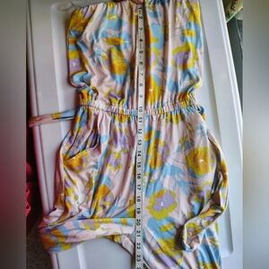 Rachel Pally strapless jumpsuit, pink with yellow flowers, with pockets, modal, full stretch, size XS, adjustable straps at waist, 26 inch inseam, 92% modal very soft fabric especially for sensitive skin, 8% spandex, 13 inch bust measurement that stretches up to 18 = 36 inches, 12 inch waist measurement that stretches up to 17 = 34 inches, 44 inch length, super comfy casual wear, summer, cruise vacation, clean garment in excellent condition.