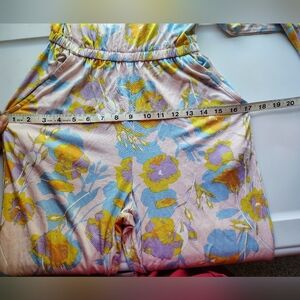 Rachel Pally strapless jumpsuit, pink with yellow flowers, with pockets, modal, full stretch, size XS, adjustable straps at waist, 26 inch inseam, 92% modal very soft fabric especially for sensitive skin, 8% spandex, 13 inch bust measurement that stretches up to 18 = 36 inches, 12 inch waist measurement that stretches up to 17 = 34 inches, 44 inch length, super comfy casual wear, summer, cruise vacation, clean garment in excellent condition.