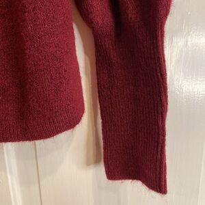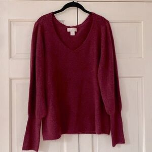 Excellent preowned condition with no flaws! Wool blend. Super soft balloon sleeve sweater. Pinkish maroon color. Puffed balloon sleeves with fitted cuffs. Fabric details in photo. Measurements below.
