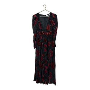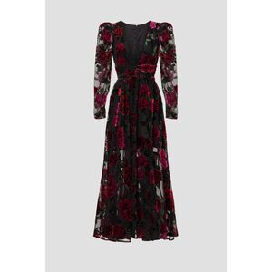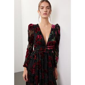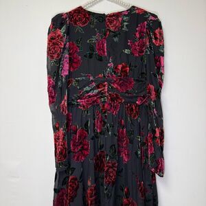 Multicolor floral velvet (80% Rayon, 20% Nylon). A-line. Long sleeves. Plunge neck. Back zipper closure. 53 from shoulder