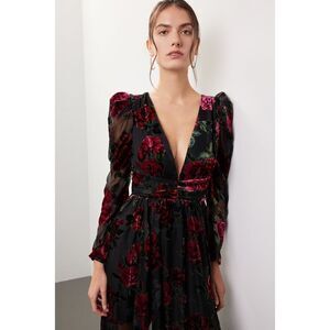 Multicolor floral velvet (80% Rayon, 20% Nylon). A-line. Long sleeves. Plunge neck. Back zipper closure. 53 from shoulder