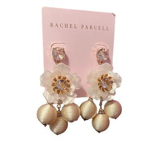 Elevate your style with these stunning Rachel Parcell Floral Statement Chandelier Earrings. The intricate design features beautiful flowers in white with clear rhinestone accents, adding a touch of glamour to any outfit. These earrings measure 2.75 inches in length and are perfect for any occasion.