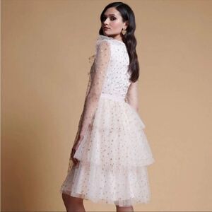 Elegant long sleeve dress with gold star details. Features a layered skirt and sheer sleeves. Perfect for special occasions.